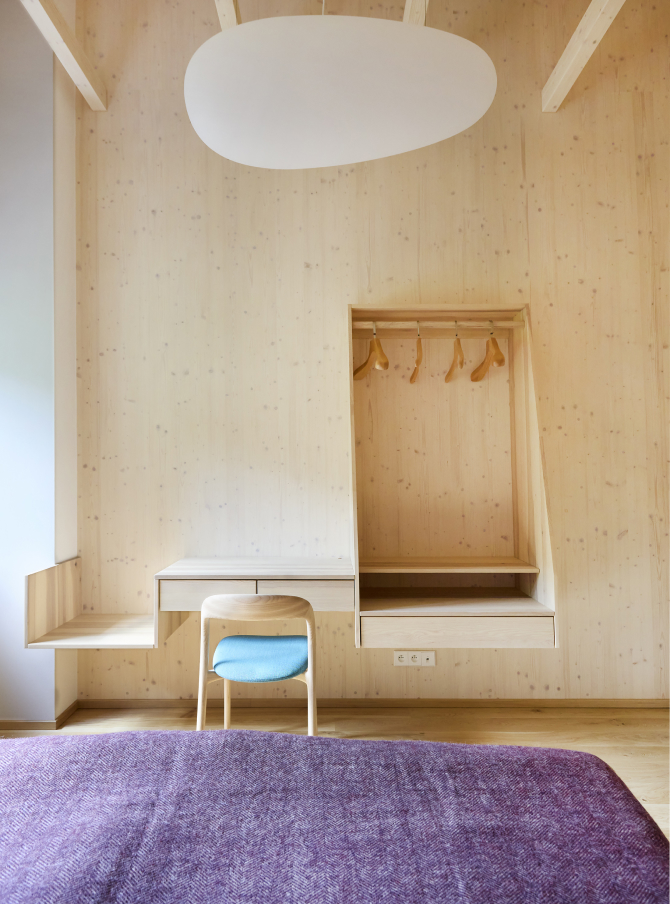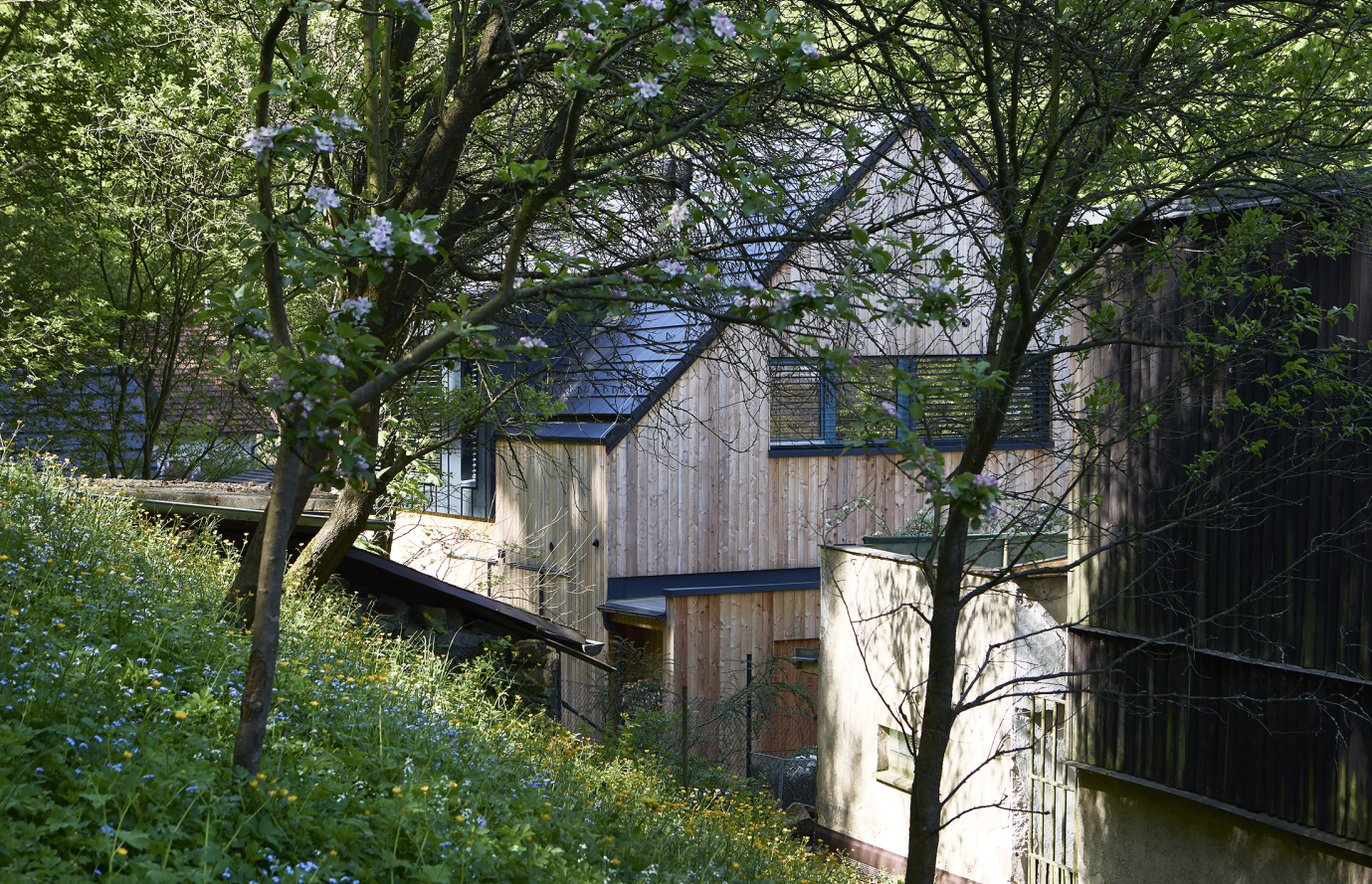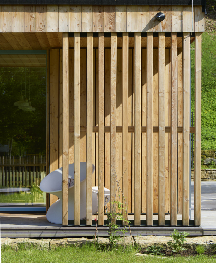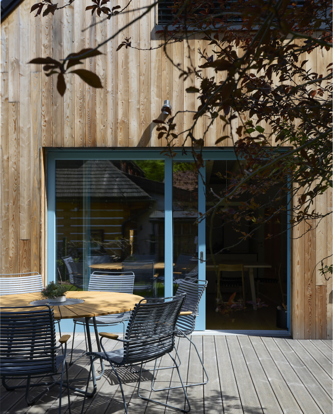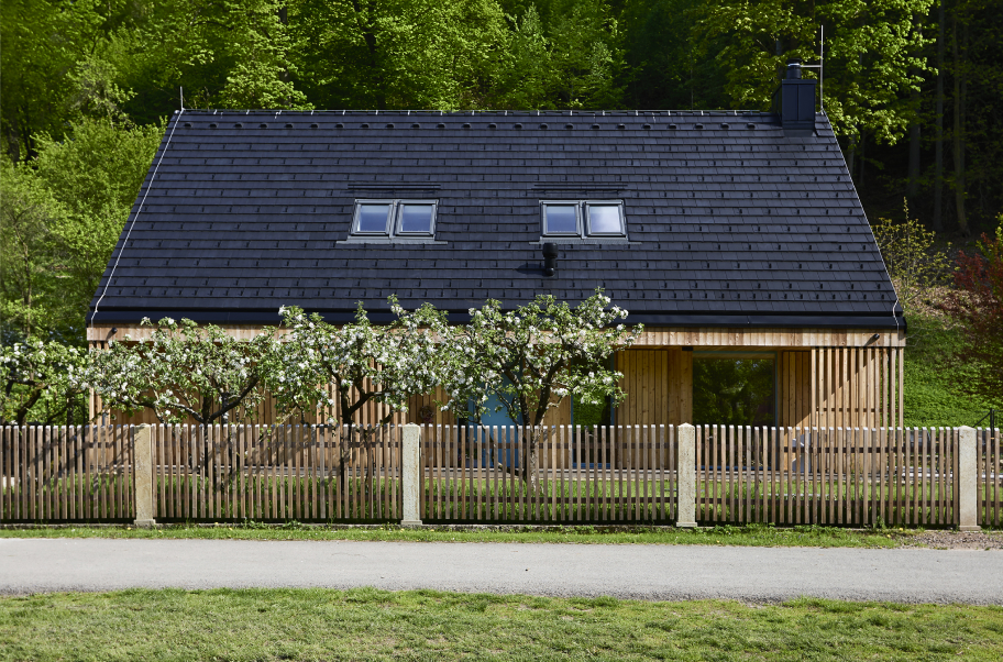 Od začátku jsme inklinovali k dřevostavbě, která by přirozeně zapadla do místní zástavby. Dřevo vnímáme jako materiál, který sem patří esteticky i pocitově. V těsném sousedství navíc stojí památkově chráněná roubenka, a proto jsme se záměrně nevydali cestou napodobování, ale zvolili jsme současné pojetí dřevostavby pro 21. století.