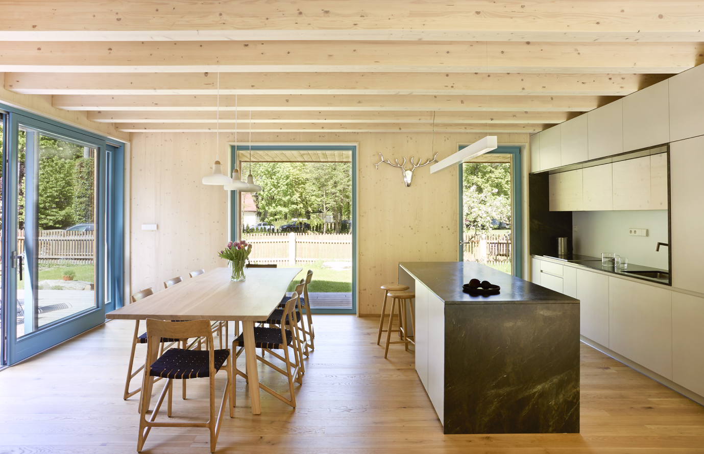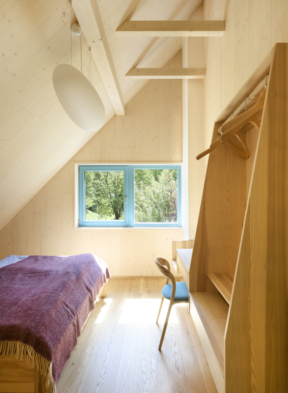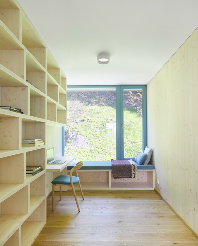 V interiéru je hodně přiznaného pohledového dřeva. Ať už jde o CLT panely nebo obklady biodeskou. Hlavnímu obytnému prostoru dominují velké prosklené plochy se vstupem na terasu a také krbová kamna. Na stropě jsou výrazné pohledové dřevěné trámy, doplněné o akustické podhledy v meziprostoru, které dokreslují charakter moderní chalupy. Nábytek byl zvolen s ohledem na charakter a provoz domu – tedy především na jeho společenskou funkci. Tím, že je autorem návrhu domu i jeho interiéru jeden architekt, ladilo se vybavení, jeho účel a pojetí již od počátku spolupráce. Veškeré úložné prostory v domě – včetně knihovny či poliček v hlavní obývací místnosti - tak jsou na míru dělané od truhláře ze stejného materiálu jako je konstrukce domu.