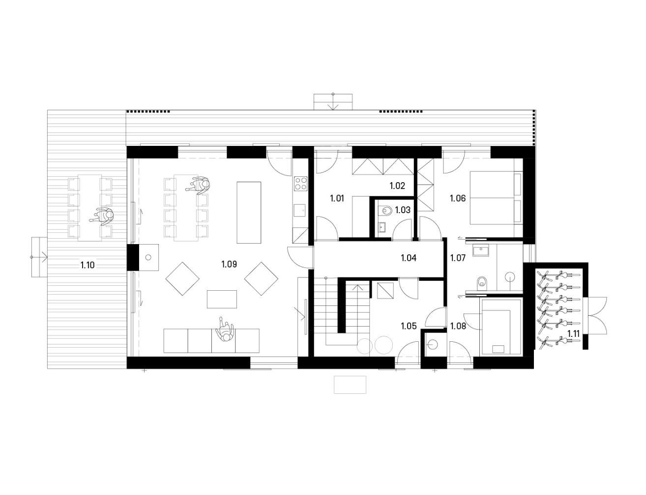 / architekt Michal KotlasRodinný dům jsme postavili na rovinatém pozemku nedaleko centrální části obce, na úpatí kopce, kde vykukuje místní dominanta – zřícenina středověkého hradu. Cestu, která vede k domu a dále už nepokračuje, lemují malebné chaloupky a chalupy. Na protilehlém pozemku přes cestu je volná nezastavěná louka, která ústí na výletní stezku kolem Divoké Orlice - skvělé místo k vycházkám kouzelnou přírodou orlickohorského podhůří. Dřevostavbu jsme umístili do podobné stopy, kde stál kdysi dům původní. Je to tradiční obdélník, s jedním podlažím a s podkrovím, které je kryto sedlovou střechou. Hřeben je srovnán podélně s delší stranou pozemku a cestou. Vstupní straně domu dominuje po celé jeho délce zápraží kryté přesahem střechy, které je propojeno s hlavní terasou před obytným prostorem. Směrem do stráně a s výhledem na hrad jsme do střechy umístili jednoduchý vikýř, který uvnitř zvětšuje prostor pro pracovnu a schodiště. Nad domem, ve stráni, se nachází původní sklep, který majitelé domu obnovili a opatřili střechou a okny ve stejném stylu, jako má novostavba.